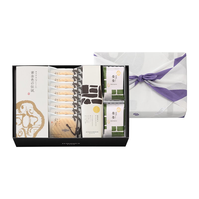 お菓子を詰める箱はシックな黒でお菓子が映えるデザインです。 蓋は竹でできており、漆黒に塗られ編み上げられた竹の持つ雰囲気は和の情緒があります。温もりがあり、特別な方への贈り物に最適です。