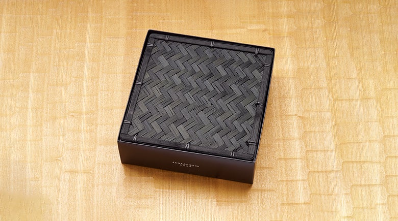 お菓子を詰める箱はシックな黒でお菓子が映えるデザインです。 蓋は竹でできており、漆黒に塗られ編み上げられた竹の持つ雰囲気は和の情緒があります。温もりがあり、特別な方への贈り物に最適です。