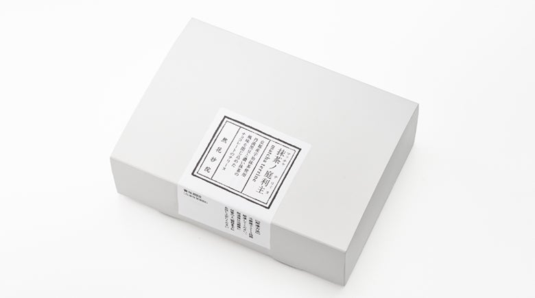 ホワイトチョコと抹茶を合わせた濃厚なテリーヌ。黒豆と濃い抹茶の旨味を閉じ込めました。甘納豆が生地の中に入っており、食感のアクセントになっています。渾然一体となった素材の風味をお愉しみください。